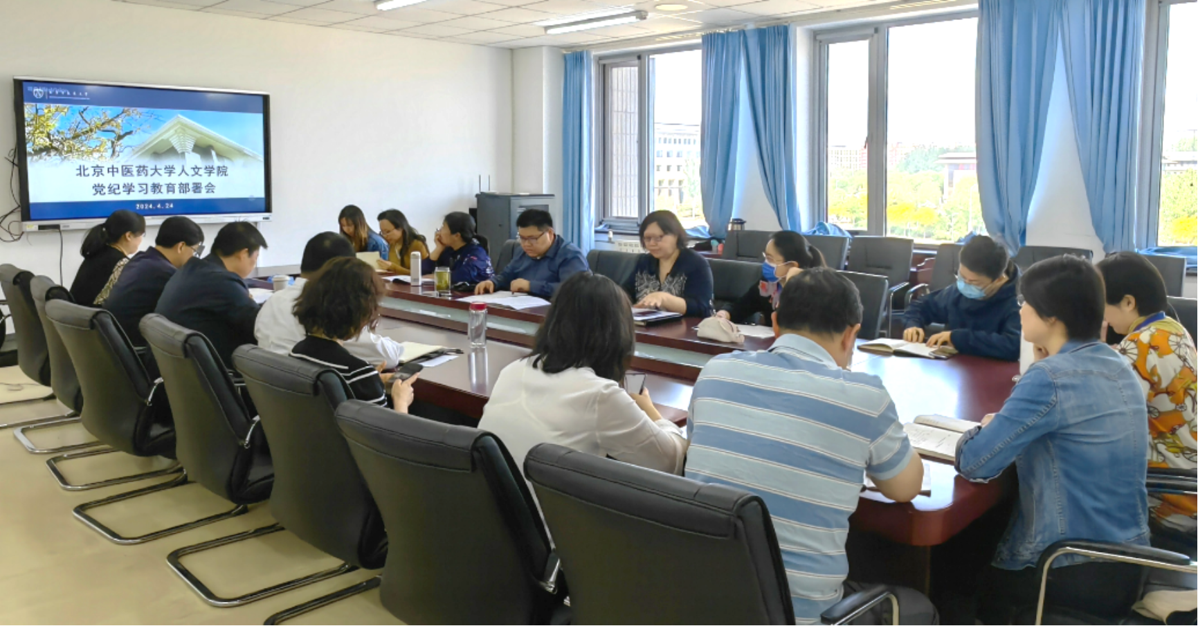 4月24日上午,人文学院召开党纪学习教育部署会,学院班子成员,系部主任、副主任,党支部书记,党政综合办公室全体教师参加了会议。会议由人文学院党委书记张小勇主持。